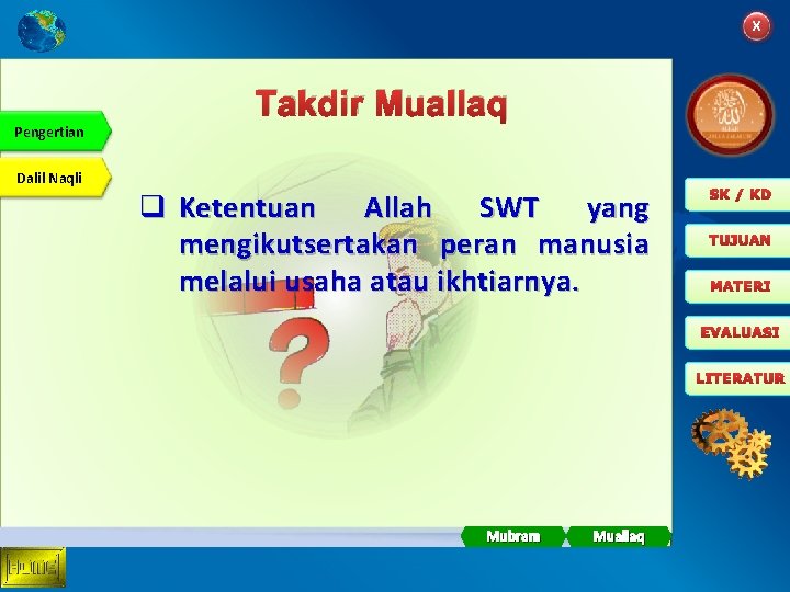 Dengan demikian segala sesuatu yang terjadi tentu ada takdirnya termasuk manusia. Dalam hal ini juga merupakan sebagai keadaan yang tidak sempurna sehingga kehendak Allah SWT dan orang harus menerimanya. Takdir Muallaq dan Takdir Mubram Takdir adalah ketentuan suatu peristiwa yang terjadi di alam raya ini yang meliputi semua sisi kejadiannya baik itu mengenai kadar atau ukurannya tempatnya maupun waktunya.