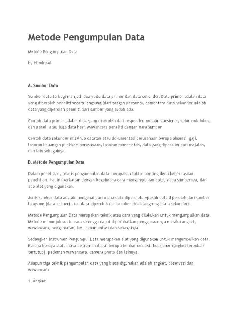 Jan 06 2021 Data yang dimaksud meliputi banyak sekolah banyak siswa hasil belajar siswa banyak guru latar belakang pendidikan guru suasana tempat belajar dan sebagainya. Data bisa berwujud suatu keadaan gambar suara huruf angka matematika bahasa ataupun simbol-simbol lainnya yang bisa kita gunakan sebagai bahan untuk melihat lingkungan obyek kejadian ataupun suatu konsep. Jan 16 2020 Teknik pengumpulan data adalah cara yang digunakan peneliti dalam mendapatkan data di lapangan.