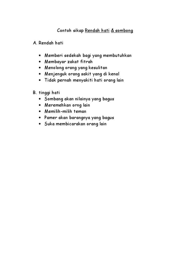 Al-Furqon ayat 63 Adapun hamba-hamba Tuhan Yang Maha Pengasih itu adalah orangorang yang berjalan di bumi dengan rendah hati dan apabila orangorang bodoh menyapa mereka dengan kata-kata menghina mereka mengucapkan salam Kemenag RI1993 365. Fahmi termasuk anak yang berperilaku rendah hati. Apr 03 2019 Contoh Sikap Rendah Hati.