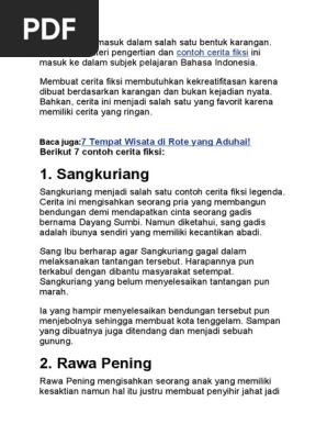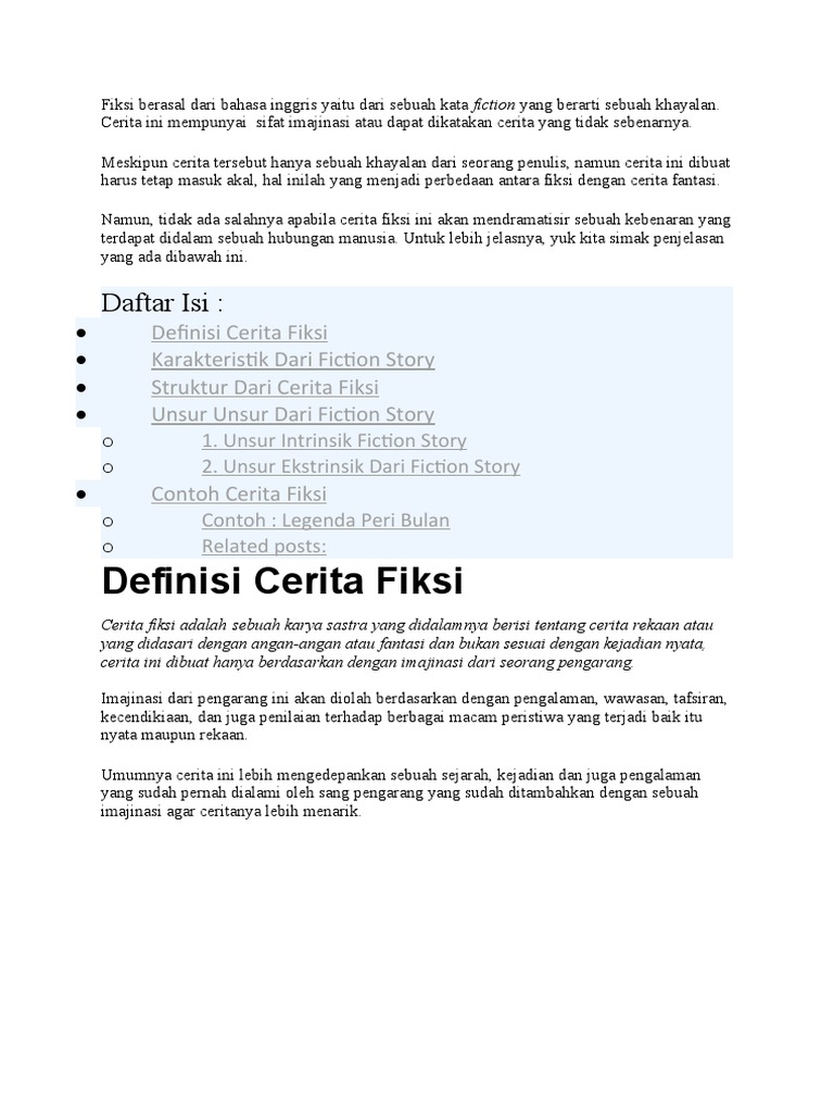 Sep 16 2020 Contoh Teks Cerita Sejarah Fiksi Jaka Tingkir adalah tokoh nyata yang ada dalam sejarah tetapi sering dikaitkan dengan berbagai cerita fantasi. Apr 22 2021 Contoh Cerita Fiksi Cerita fiksi merupakan sebuah karya sastra yang isinya mengenai cerita karangan ataupun cerita yang berdasarkan angan angan fantasi saja dan bukanlah atas dasar suatu kejadian yang nyata hanyalah didasari imajinasi sipengarang saja. Isi sebuah cerita dalam cerita fiksi tidak memerlukan pengamatan dan data sesuai dengan kenyataan saat ini.