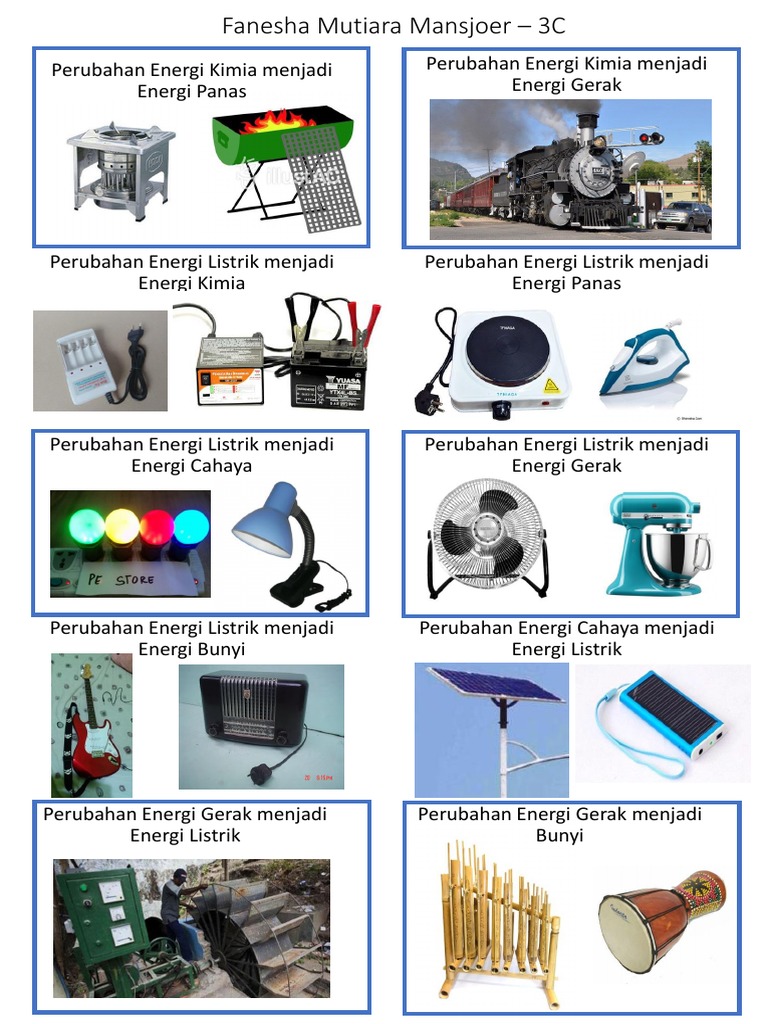 Inilah pembahasan materi dan kunci jawaban Buku Tematik Kelas 3 SDMI Tema 6 soal contoh perubahan energi kimia menjadi energi gerak di kurikulum 2013. Lampu listrik kipas angin setrika. Inilah Contoh-contoh Perubahan Energi Listrik Jadi Energi Gerak Energi Cahaya Energi Panas dan Energi Bunyi - Fotokita.