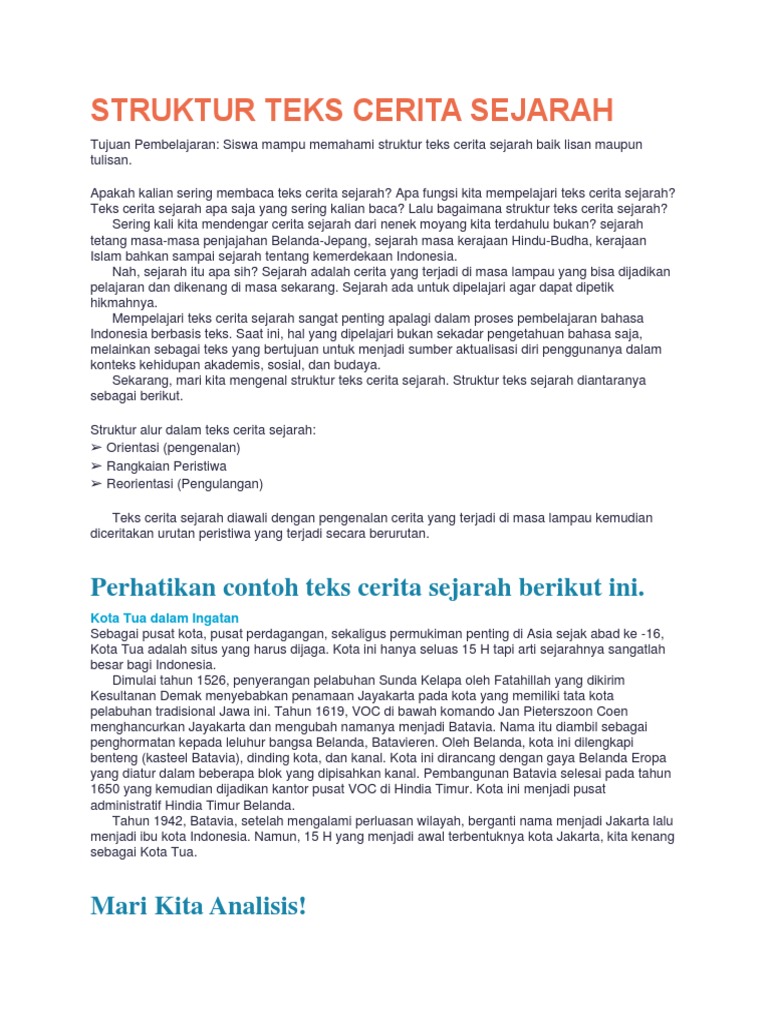 Selain itu definisi teks cerita sejarah adalah catatan-catatan terjadinya peristiwa pada masa lalu yang dikembangkan berdasarkan bukti yang. Kejadian tersebut juga menjadi latar belakang terjadinya peristiwa yang memiliki nilai sejarah. Mar 01 2021 Dalam cerita juga mengandung beberapa unsur sejarah yang berhubungan dengan peristiwa itu.
