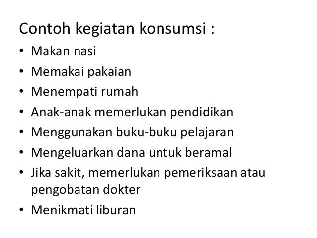 Apr 27 2016 Kegiatan konsumsi ini dapat dicontohkan sebagai berikut. Oct 15 2020 Contoh Kegiatan Konsumsi. Apr 01 2021 Pegeluaran konsumsi masyarakat merupakan pembelanjaan yang dilakukan oleh rumah tangga terhadap barang-barang akhir dan jasa-jasa dengan tujuan untuk memenuhi kebutuhan seperti makanan pakaian dan barang-barang kebutuhan lainnya serta berbagai jenis pelayanan contoh kegiatan konsumsi.