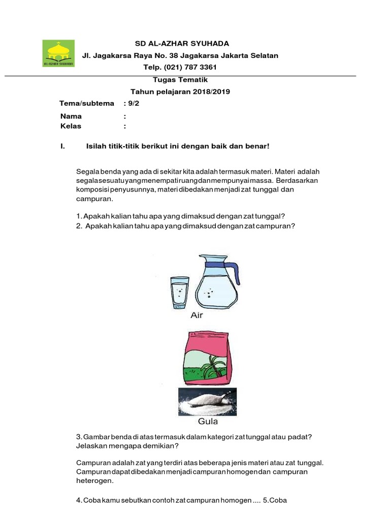 Banyak jenis materi di lingkungan sekitarmu. Berdasarkan bacaan di atas jawablah pertanyaan berikut. Agar lebih mudah dalam memahami macam materi ini maka dilakukan pengklasifikasian materi menjadi zat tunggal dan campuran.