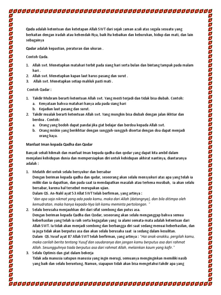Sebutkan satu contoh qadar. Contoh dari Qada yaitu sebagai. Qada dan Qadar merupakan rukun iman dalam agama Islam yang wajib kita imani. Inilah salah satu bukti keimanan kepada Allah SWT.